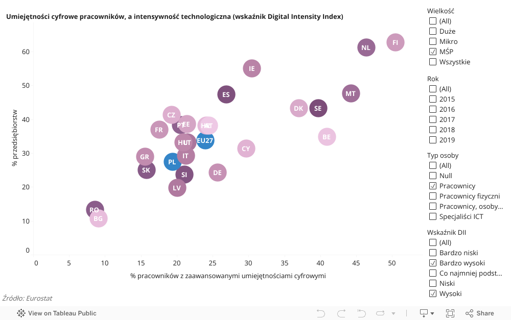 Zależność między umiejętnościami cyfrowymi pracowników a intensywnością technologiczną przedsiębiorstw.